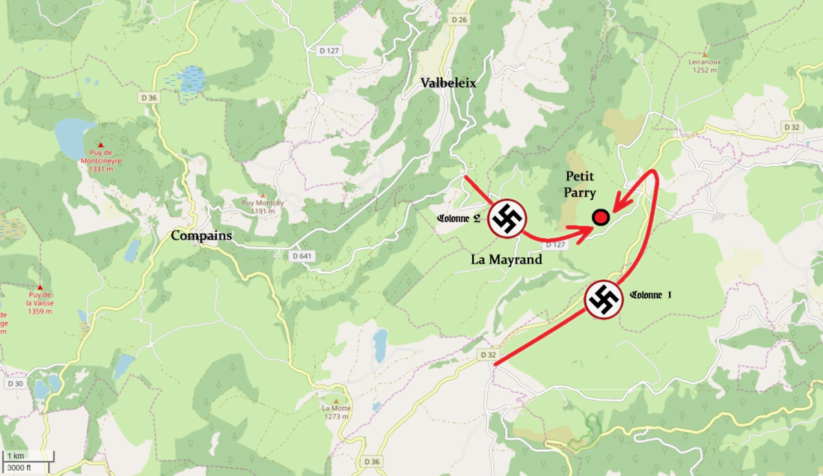 Après quelques hésitations, nous traversons ce découvert et avons la chance de passer et de nous cacher dans le bois en face quelques secondes seulement avant l'arrivée d'un convoi allemand qui, à Val Beleix, empruntera le chemin I.C. 27 et prendra le Petit Parry à revers. Seul le manque de synchronisation des deux mouvements fit manquer leur but aux colonnes allemandes et permit à beaucoup d'entre nous de s'en tirer.