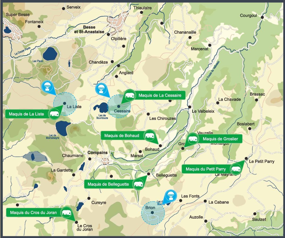 Comme cela apparaît sur la carte ci-contre, le maquis du Petit-Parry n’était pas isolé. De nombreux groupes étaient parsemés dans cette région montagneuse recouverte de forêts. Ils interagissaient nécessairement entre eux et les nouvelles recrues étaient toutes instruites au buron de la Cessaire de Lucien GOIGOUX, grand organisateur de la résistance dans la région (2).