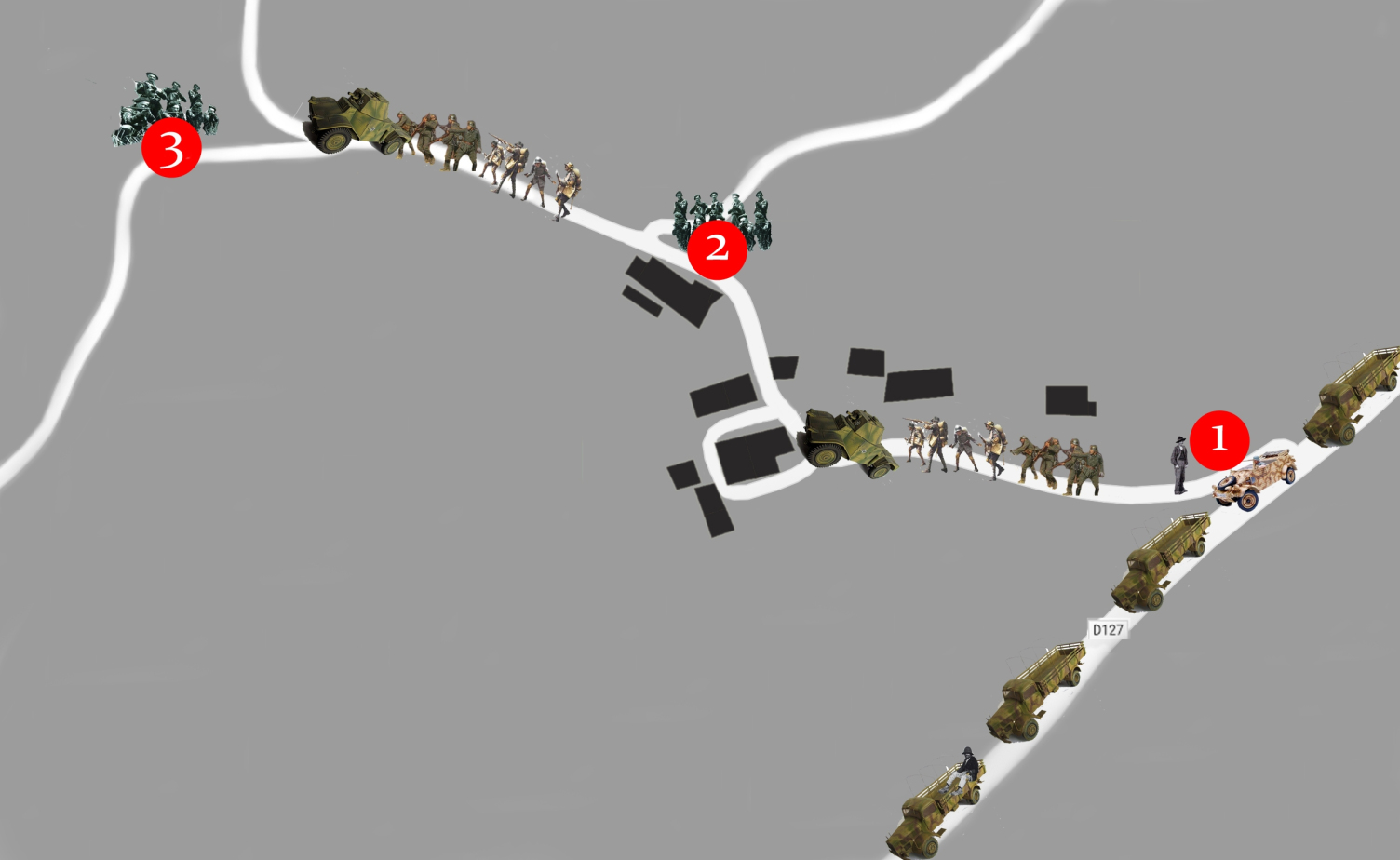 Seuls restent donc sur place en plus de la Dizaine de sécurité quelques éléments de la Trentaine qui n’ont pas entendu les ordres ou qui entreprennent la destruction des documents utiles à l’ennemi et, bien sûr, quelques habitants rapidement dans le champ de mire de l’ennemi. La colonne allemande s’est arrêtée sur la route I.C. 127, en contrebas du hameau.